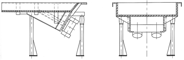 該系列給料機的給料過程是利用特制的振動電機或兩臺電動機帶動激振器驅動給料槽沿傾斜方向作周期直線往復振動來實現,當給料槽振動的加速度垂直分量大于重力加速度時,槽中的料被拋起,并按照拋物線的軌跡向前跳躍運動,拋起和下落在瞬間完成,由于激振源的連續激振,給料槽連續振動,槽中的煤連續向前跳躍,以達到給料的目的。